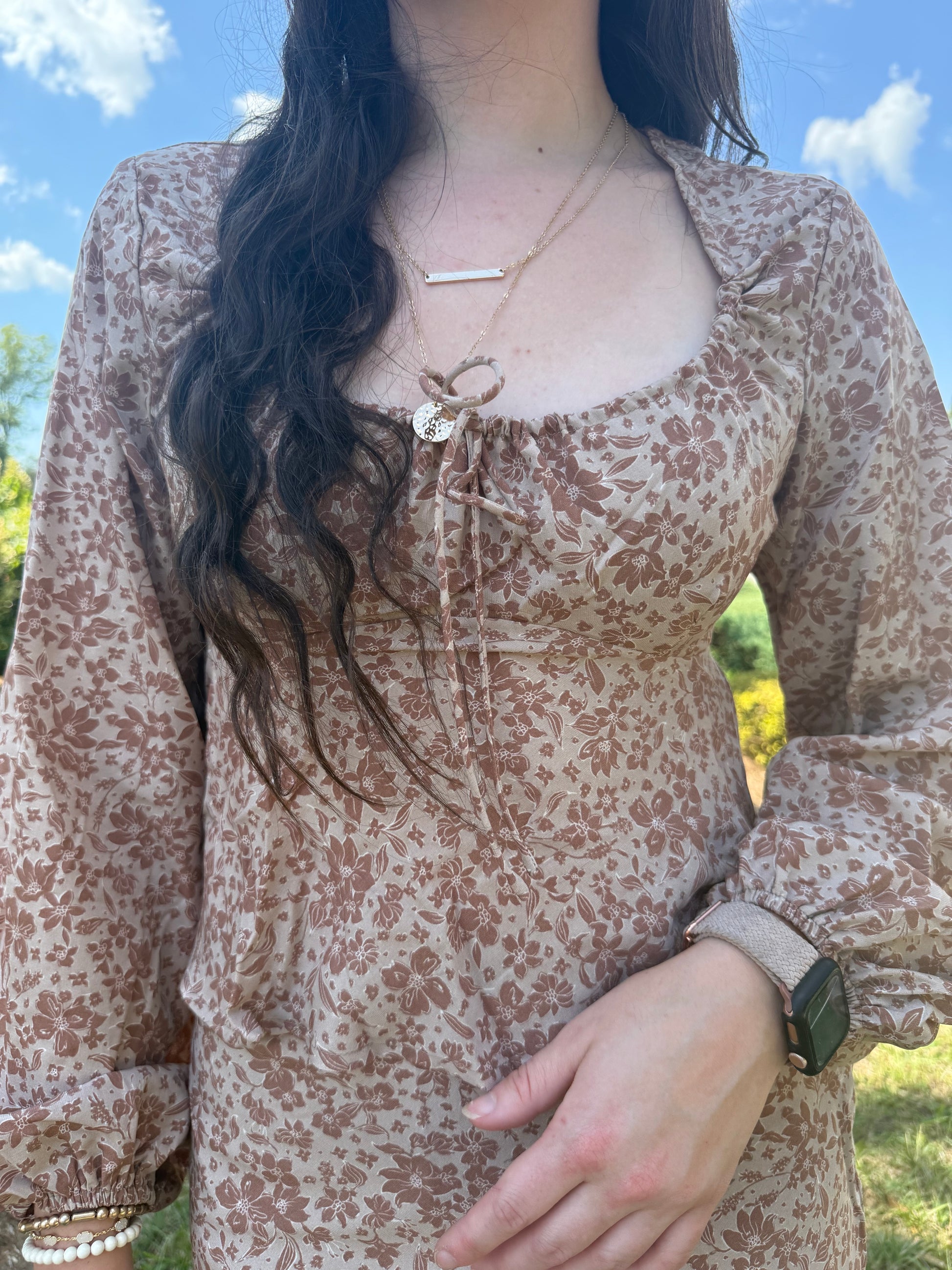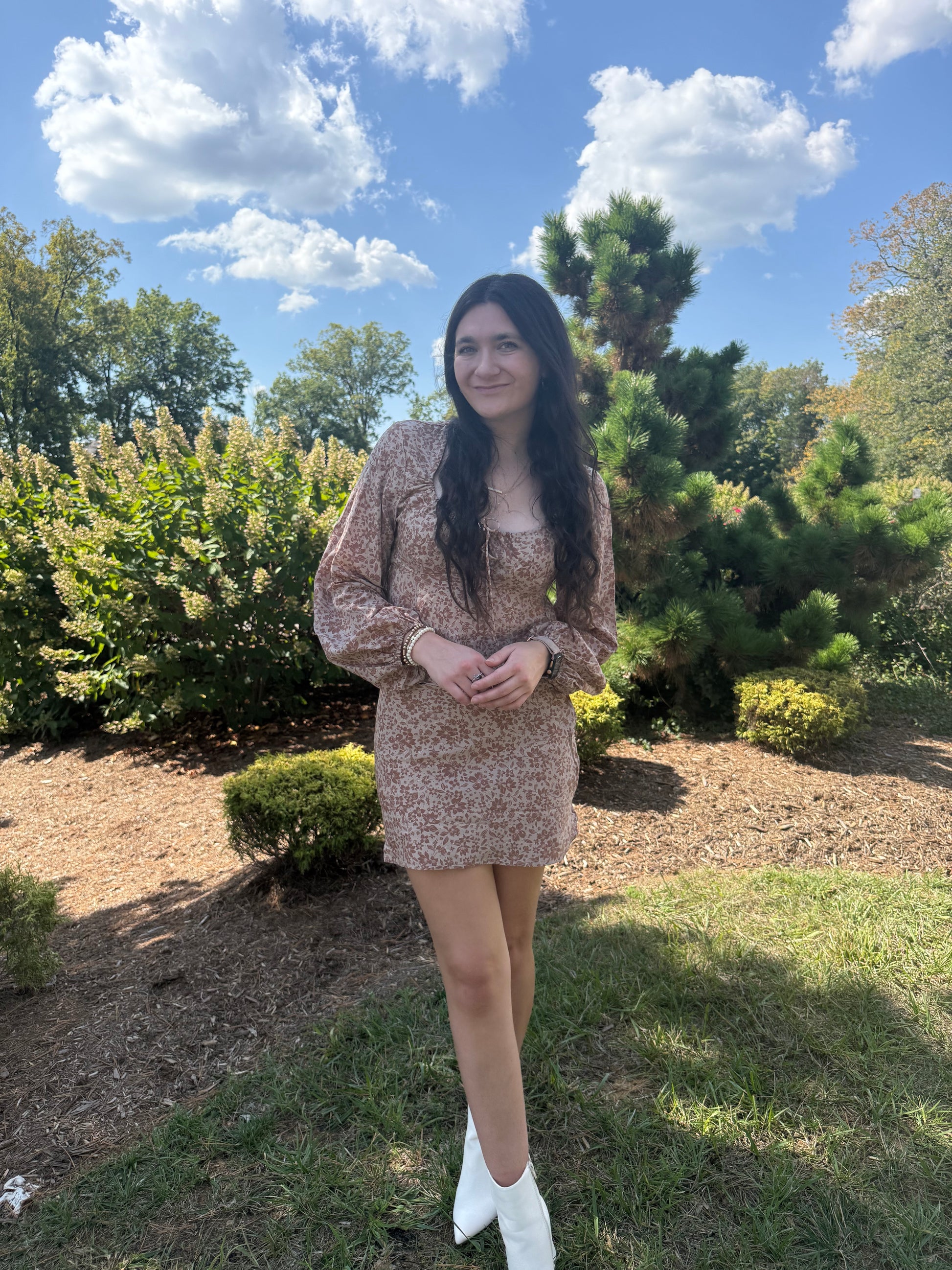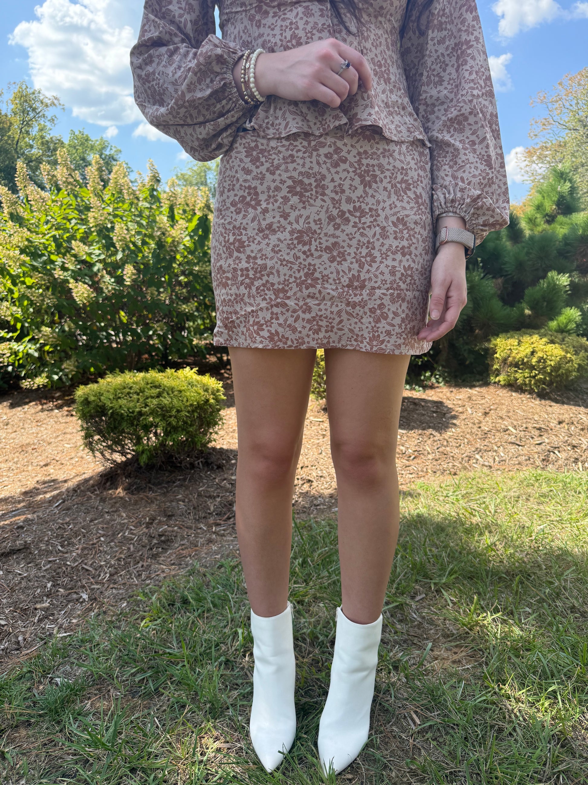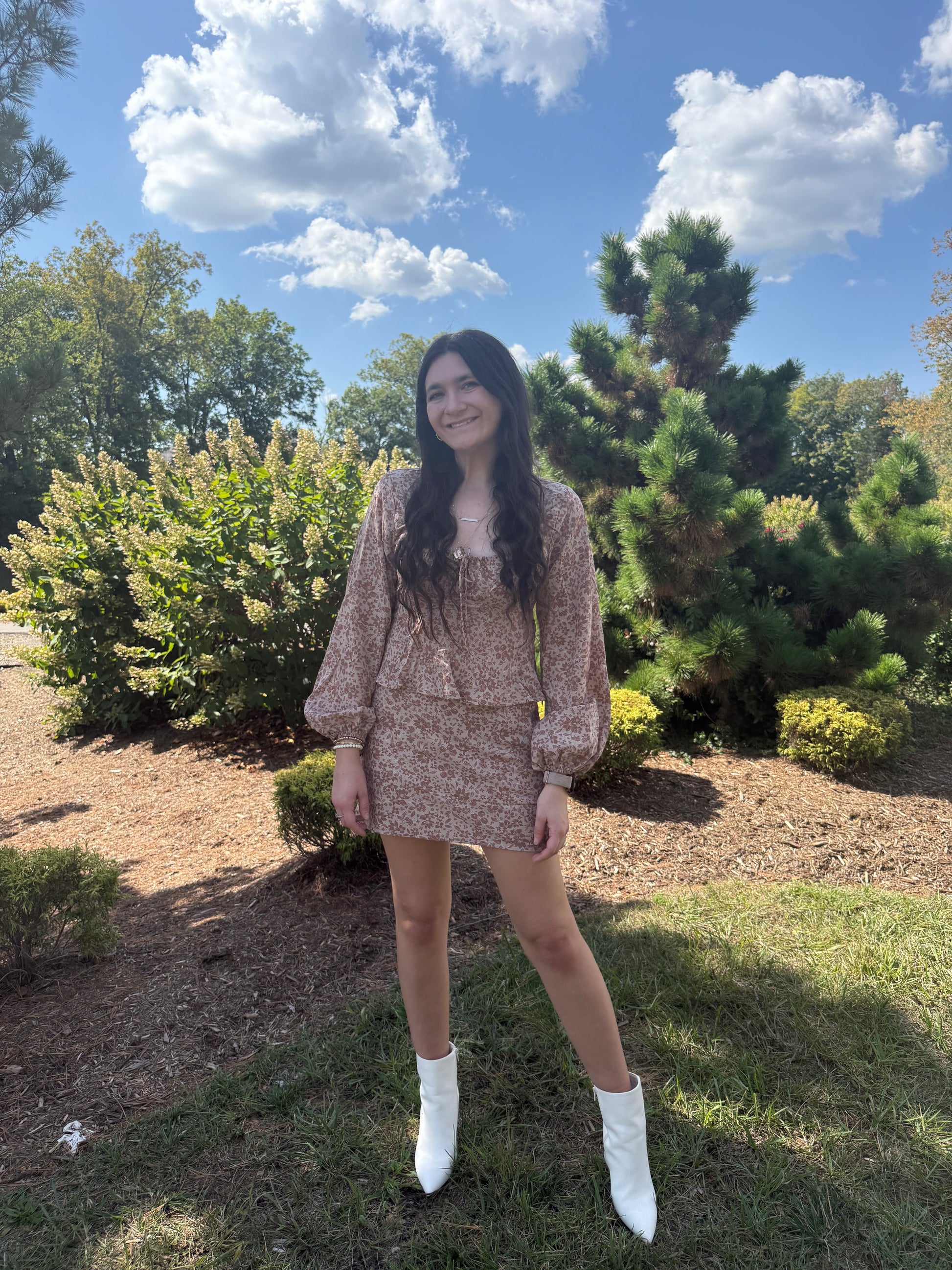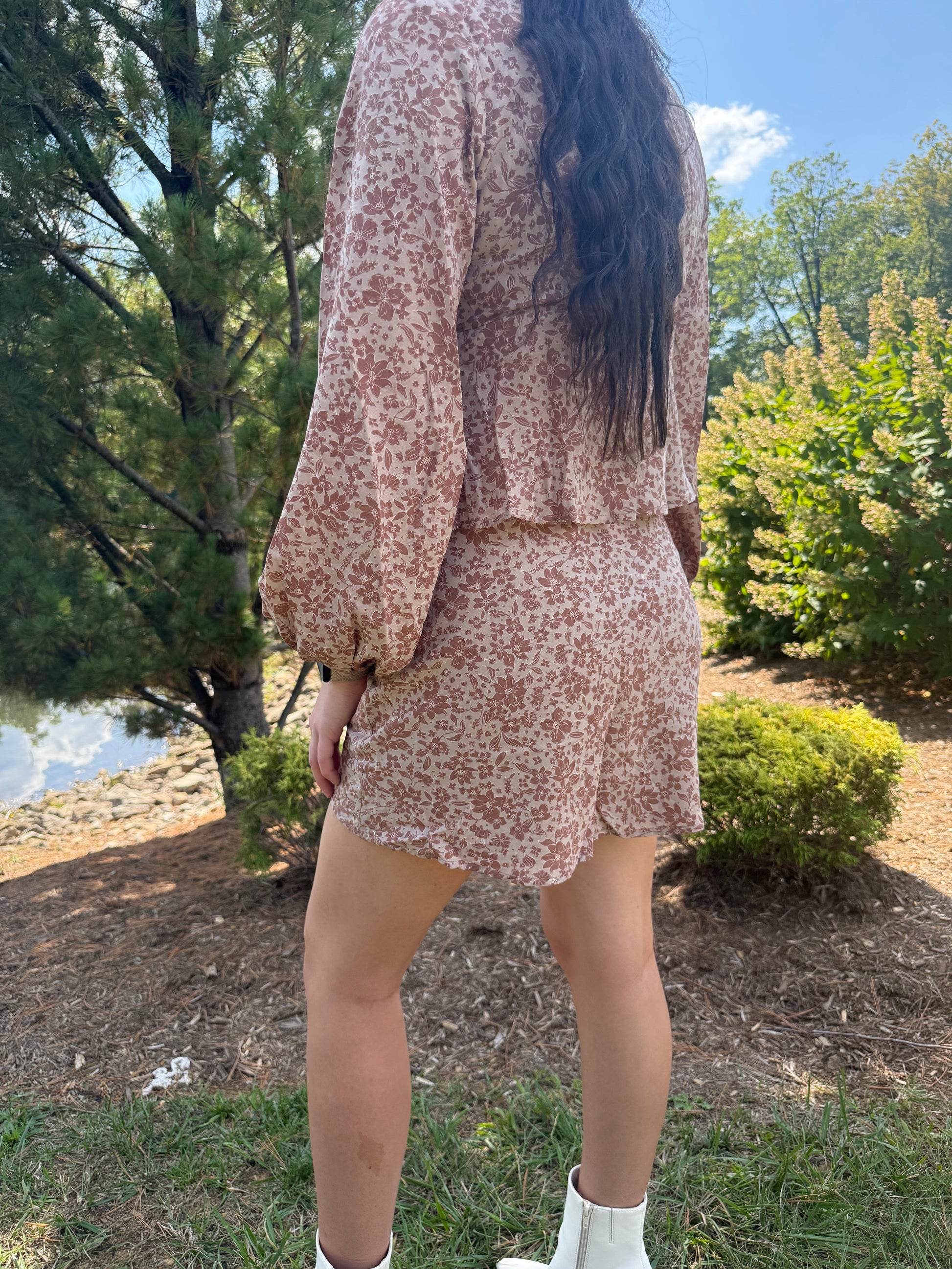shirred neck long sleeve top with mini skirt